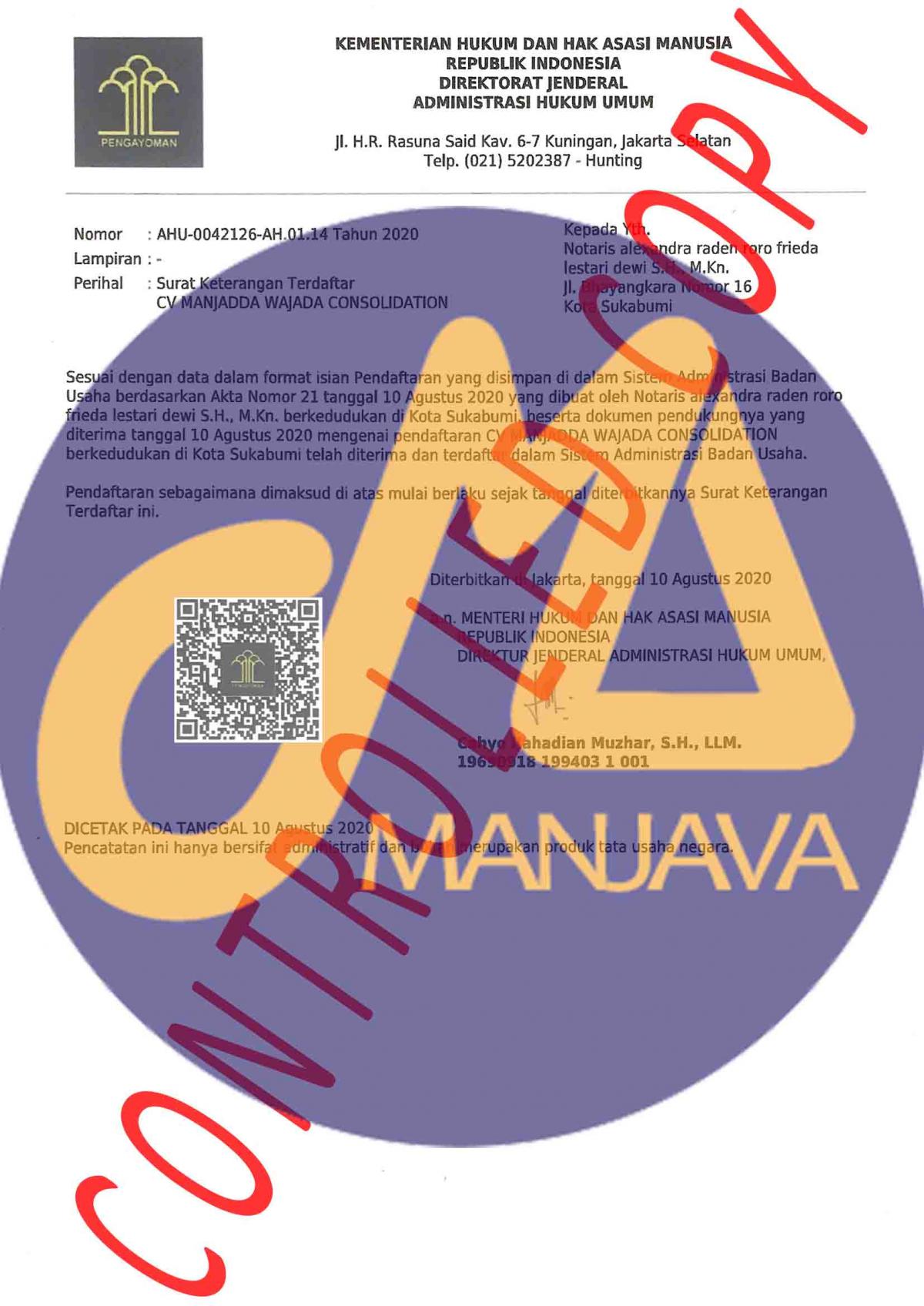 1. SK Terdaftar Kementerian Hukum dan HAM Republik Indonesia Direktorat Jendral Administrasi Hukukm Umum dengan Nomor AHU-0042126-AH.01.14 pada tanggal 10 Agustus 2020,